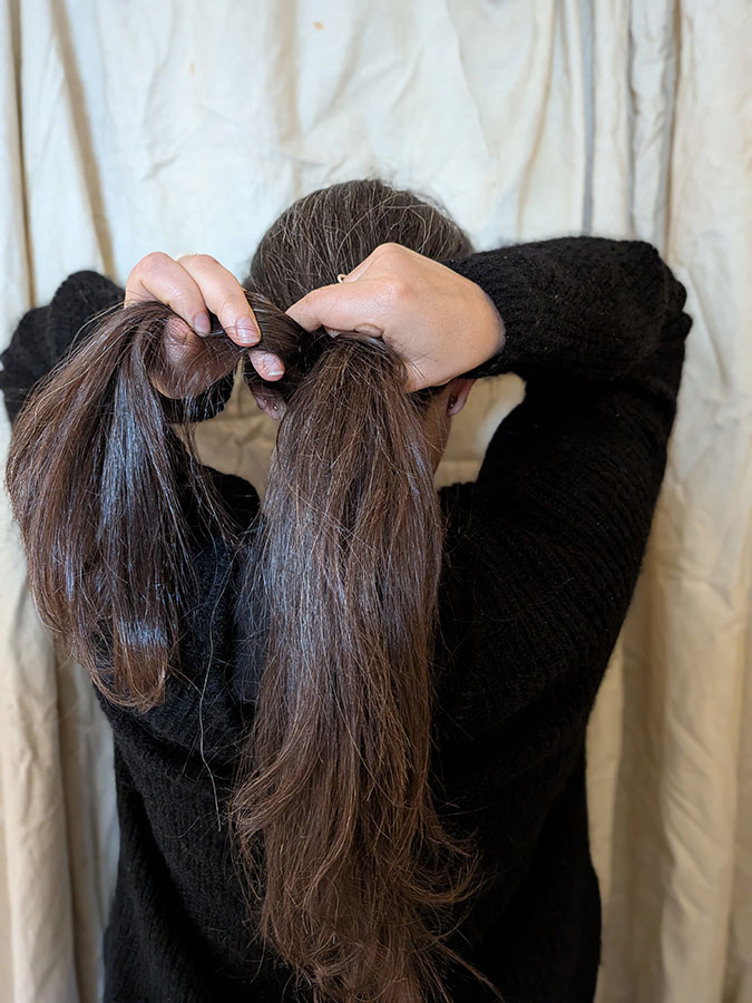 De cette immobilité naît pourtant un processus actif: une mèche de cheveux devient le point d’ancrage d’une chaîne textile en perpétuelle transformation.